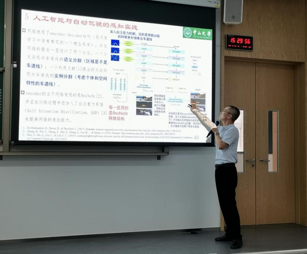 随后,张老师从自动驾驶的智能感知出发,介绍了其所带领的课题组在车道线检测领域所做的实践与取得的成果。通过张老师对深度学习网络架构的介绍,同学们对基于人工智能的感知实践有了更深层次的认识,同时也有助于激发同学们对相关领域的研究兴趣。
