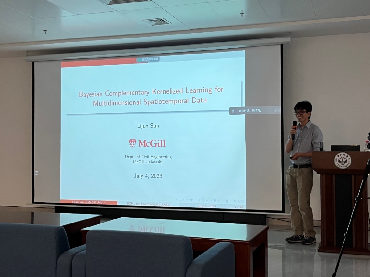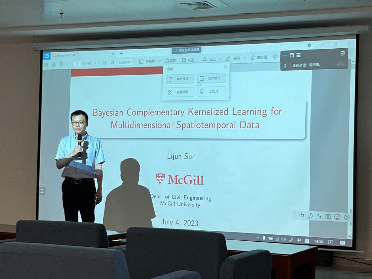 此次讲座由我院副院长蔡铭教授主持。蔡老师首先代表学院感谢孙老师的到来,并简要介绍了孙老师的情况。接着,孙老师开始了精彩的学术报告。他介绍了基于贝叶斯互补核化学习(BCKL)的方法,以实现对多维时空数据的概率建模。该方法将低秩张量分解与短程时空高斯过程(GP)相结合,两个组成部分互为补充。低秩分解用来捕捉数据中的全局/长期相关性,短程高斯过程用来表征剩余的局部变异性。大量的数值实验证实了该方法的有效性。