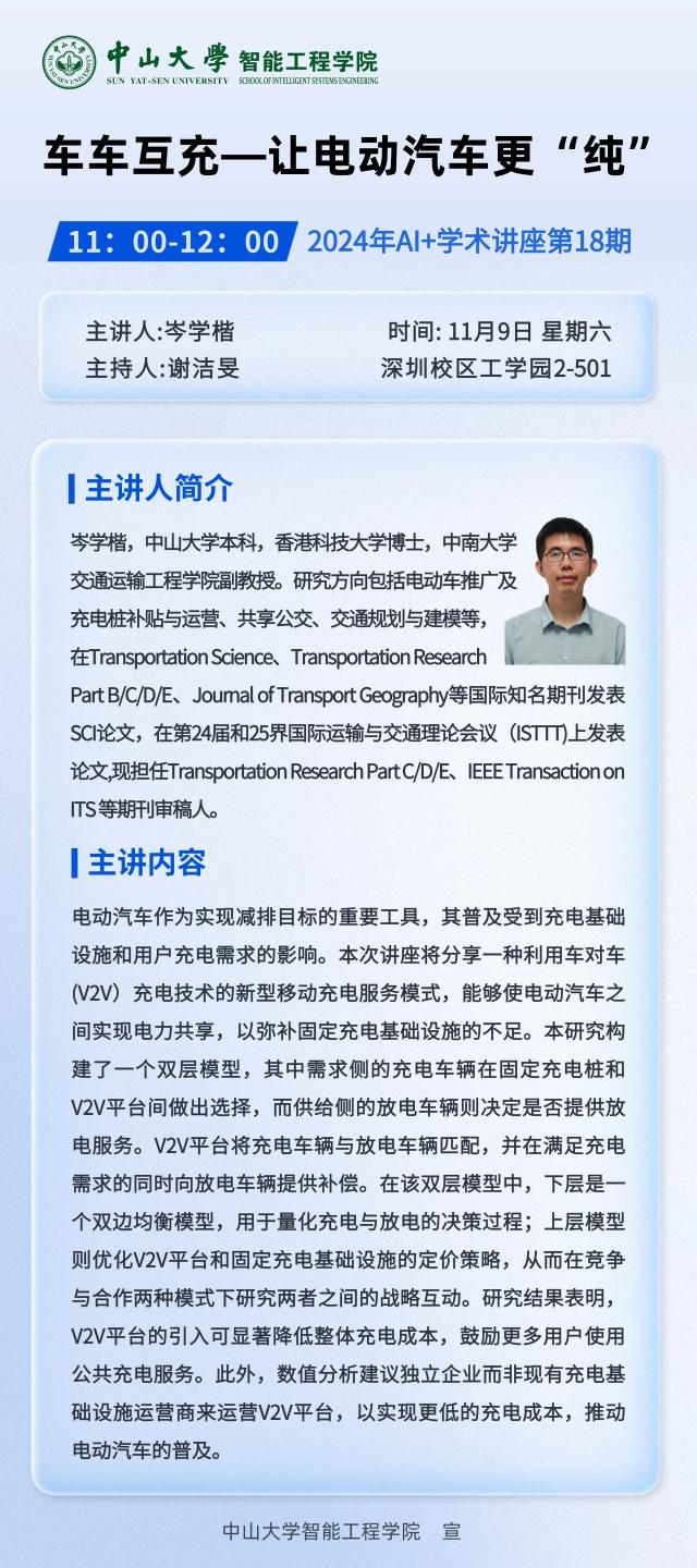 学术讲座 | 岑学楷:"车车互充-让电动汽车更“纯”的学术报告讲座